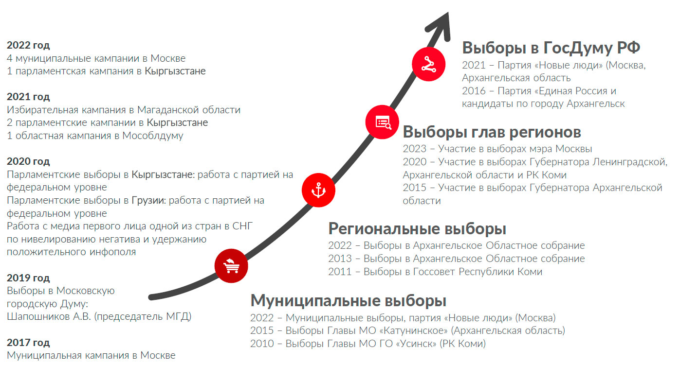 Управляем Вашей репутацией, работаем только с базовым и перетекающим электоратом, используем последние технологии E-campaigning, ведем параллельную кампанию через «партизанский» PR и разрабатываем проекты в отношении оппонентов.